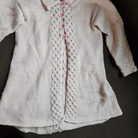 Hjemmestrikket kåpe og lue str 98, selges da mitt barnebarn nekter å bruke den.