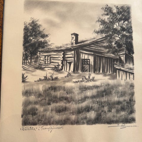 Bildet er signert, men signaturen er vanskelig å tyde så kunsterens navn er usikkert. Teknikken ser ut til å være akryl- eller fettstift og virker profesjonelt utført. Rammen er i sølvfarget tre.