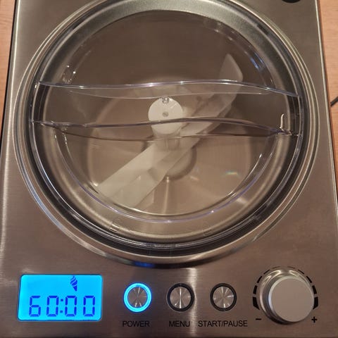 Wella Ice Cream iskremmaskin i rustfritt stål med flere tilbehørsdeler inkludert. Maskinen har digitalt display og flere kontrollknapper for innstillinger. Designet for å lage iskrem hjemme.
