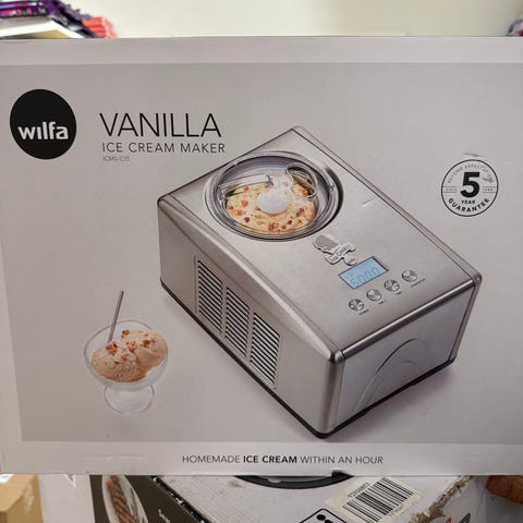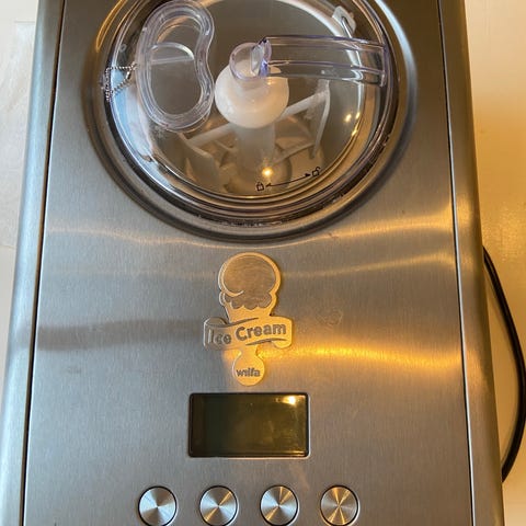 Denne bruker jeg dessverre ikke lengre. Lager god is og veldig god sorbet. Trikset er vel å la maskinen å gå i 5 min og bli kald før man heller blandingen i. Blir mindre krystaller.