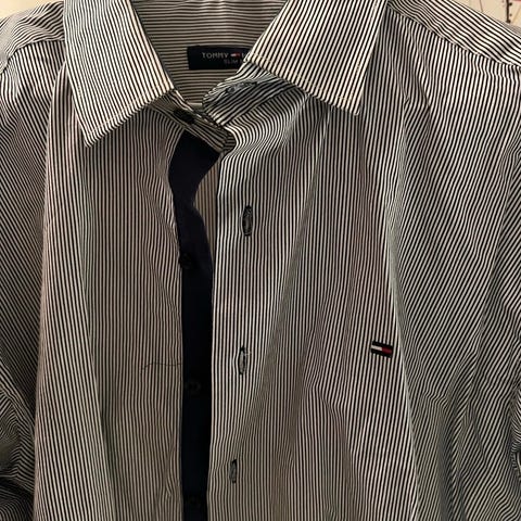 Tommy Hilfiger skjorte i størrelse XXL, herrestørrelse!. Fargen er hvit og blå. (Kjøpte selv denne på Tise som en oversized skjorte men den er alt for stor for dame 42-44). Lapp med stoff informasjon er klippet av men tror det er bomull/lin. Pen skjorte.😊