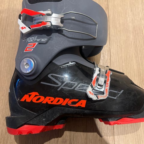 Sort alpinstøvel fra Nirdica med rød og orange detaljer strl.38 med Easy Entry og justerbar flex funksjon for perfekt tilpasning til egne preferanser.