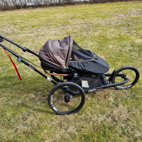 Thule urban gilder Jogger barnevogn med tre hjul og justerbart håndtak. Barnevognen har en grønn og svart fargekombinasjon og er designet for enkel manøvrering og komfort for barnet.