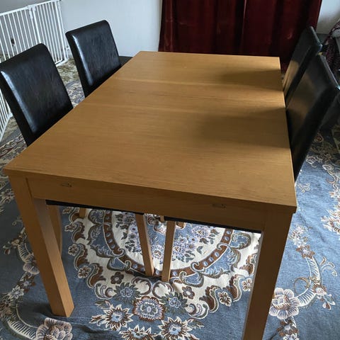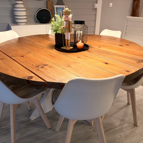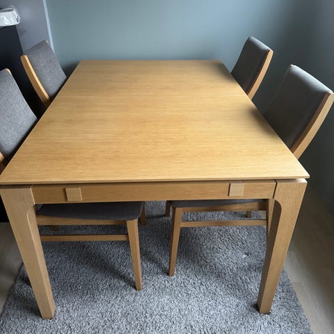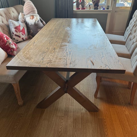 Følger med 2stk ileggsplater som er ca. 40cm brede. Hvitmalt understell og beiset/lakket bordplate.