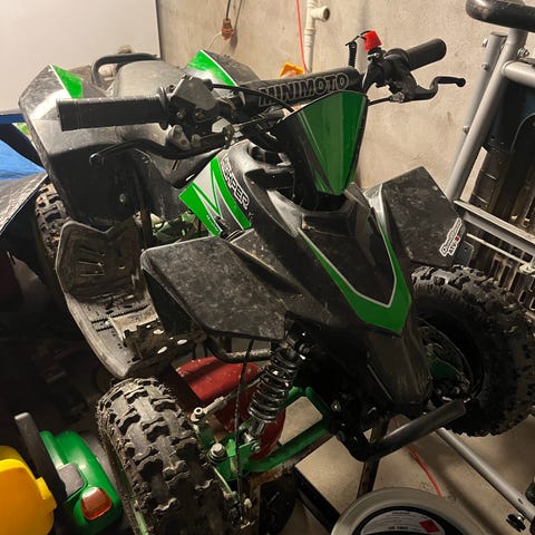 Mini ATV med 50cc black edition two. ATV-en er designet for barn og har solide dekk og robust ramme for utendørs bruk. Kjøpt på engroservice.no. 2021. Da kostet den 5000,- Ble kjørt noen runder rundt huset, før clutch røk. Var en svakhet på de tidlige modellene. Ble bestilt en kraftigere type clutch (rød type) og monterte denne. Etter dette har den stått stille i garasjen.