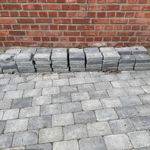 Betongheller stor 11x8x4 cm , ca 120 stk. 2 størrelser, egnet for utebruk som gangstier, terrasser eller hageområder. Materialet er betong, og de har en grå farge. Hellerne er stablet og klare for bruk i utendørs prosjekter.