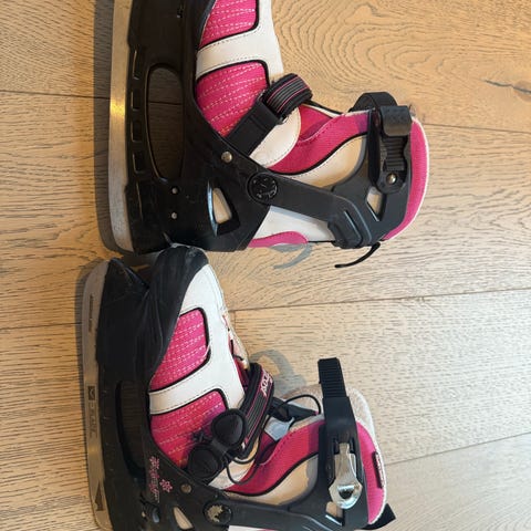 Barneskøyter i størrelse 35 med hvit skinn overflate. Skøytene er designet for ulike skøytesporter og har snøring for justerbar passform.