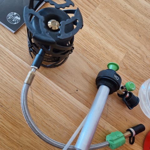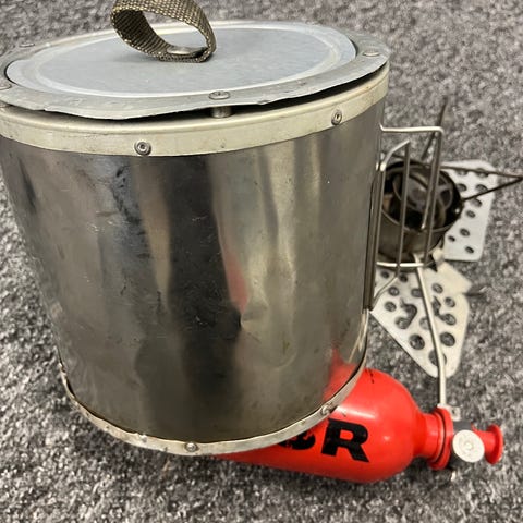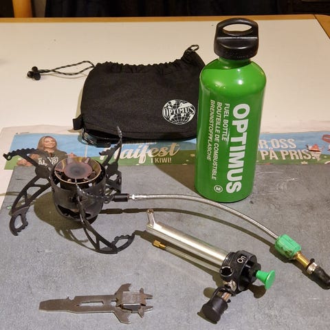 Primus Omnifiel med beholder. Brenneren har en sammenleggbar konstruksjon i metall, designet for bruk med gassbeholder til matlaging utendørs. Passer til tur- og friluftsaktiviteter.