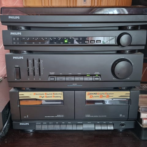 Rack fra 80-tallet! Alle komponenter ser nesten ut som nye, men dessverre virker det ikke! Ikke spør hvorfor, hadde jeg visst det så hadde det blitt rep. Det lyser i alle komponenter. Kassettspillere virker ikke, platespiller går rundt. Det medfølger ikke høyttalere. Som sagt komponenter ser ut som nye, unntatt deksel på platespiller da glassplate på toppen av racket mangler.