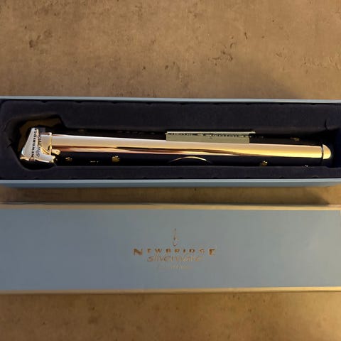 Fremstår som et ubrukt eksemplar av en forsølvet rørholder til dåpsattest, med medfølgende "stativ".