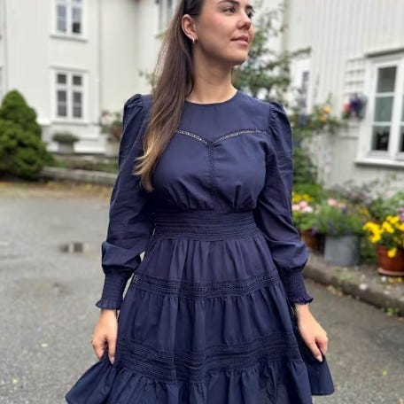 Kjolen har en feminin v-hals i omslag og lange, voluminøse ermer som tilfører et sofistikert preg. Draperingene i skjørtet fremhever fasongen og gir en flatterende silhuett, mens volangkanten nederst skaper bevegelse og liv.