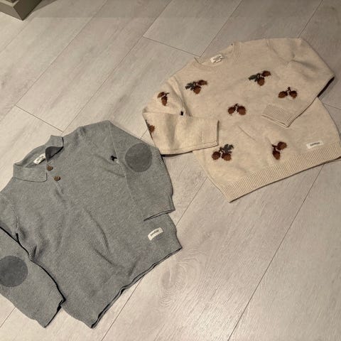 Helt nytt babysett strikket i kløfri lerkegarn. Str nyfødt