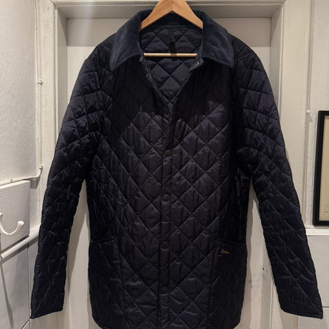 Barbour Liddesdale jakke i svart farge, laget av nylon materiale. Jakken er designet for herre i størrelse L. Den har en quiltet overflate og knappelukking.
