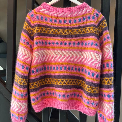Nystrikket og ubrukt i litt fluffy mohair blandingsgarn. Passer best str S.