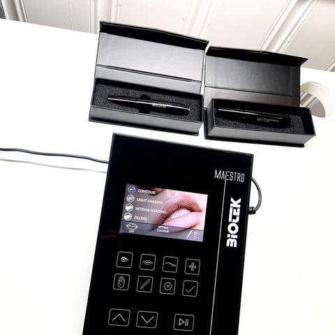 Hudpleieapparat med flere tilbehørsdeler inkludert ulike applikatorer og filtre. Enheten har en kontrollpanel med knapper og tilkoblinger for flere funksjoner. Egnet for profesjonell bruk innen hudpleie. Lite brukt, fungerer som det skal. Titusen kr pris.