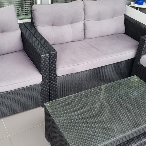 Hagemøbelsett bestående av to lenestoler, en toseters sofa, og et rektangulært bord med glassplate. Møblene er laget i rotting med mørke puter til sittekomfort. Har frem til nå kun vært lagret inne om vinteren så er i god stand. Bredde sofa 130. Høyde rygg ca 90 cm