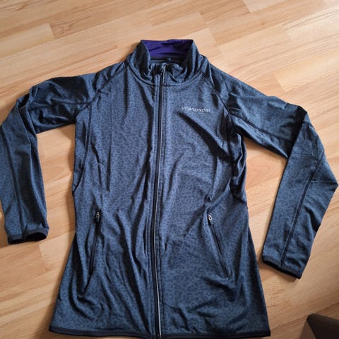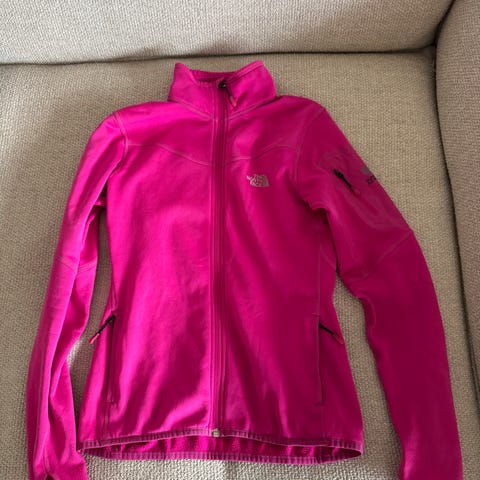 North Face treningsjakke for dame i størrelse S. Jakken har en grå front og bakside med svarte paneler på sidene. Egnet for løping, annen fysisk aktivitet eller som mellomlag på tur på kaldere dager.