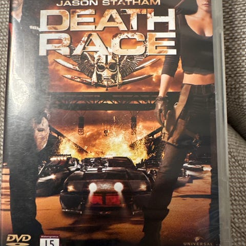 Death Race DVD med Jason Statham. Actionfilm med innhold som inkluderer bonusmateriale. DVD-formatet støtter lydspor og undertekster i flere språk.