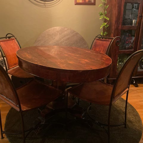 Lite bord med 2 stoler, smijern og tre