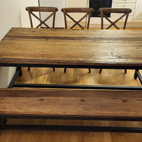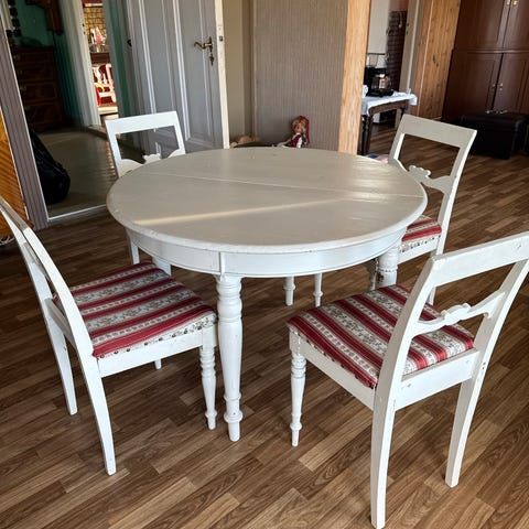 Lite bord med to stoler, stolseter og bordplate i treverk, alt annet i mørk grått smijern. De er fra 90-tallet, pent brukt etpar år, siste 20 år stått lagret innendørs i normal temperatur. Solide.