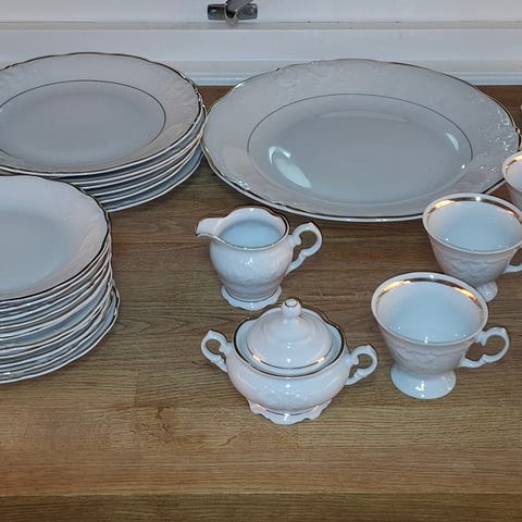 Selger et komplett og pent porselensservise i klassisk hvitt design med rillet kant og gullrand.