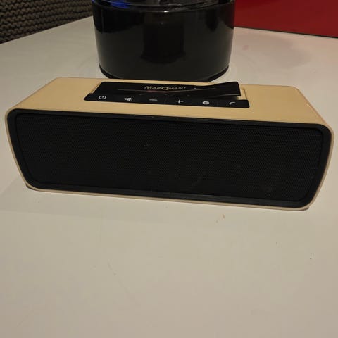 SuperTooth Bluetooth håndfri enhet med bærbar lydkapasitet. Enheten har to knapper på baksiden og en knapp på forsiden, samt en liten skjerm og mikrofon. Egnet for bruk i bil eller andre situasjoner der trådløs håndfri kommunikasjon er ønsket.