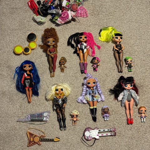 LOL Surprise dukker, totalt 12 stk i assorterte modeller. Inkluderer ulike figurer med forskjellige farger og tilbehør.