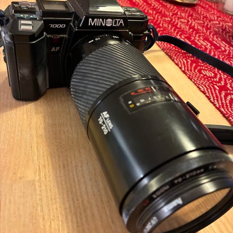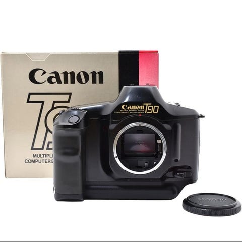 Canon T90 speilreflekskamera med kameraveske, batterilader, to objektiver, kamerastropp og fargefiltre (rød, blå, grønn). Kameraet leveres uten objektiv montert.