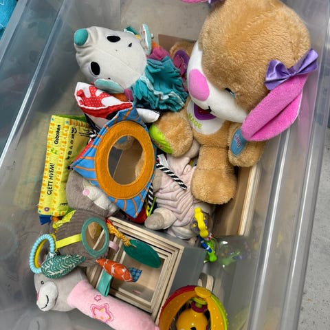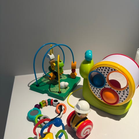 Diverse babyleker selges billig. Toget er lite brukt og har klosser barnet kan ta av og på og ellers er lekene pent brukt. Dyrene er til bruk i vann.