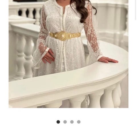 Nydelig kaftan i lys kremfarge med vakre broderte detaljer i gulltoner. Modellen har lange ermer, belte i livet og lett, luftig stoff som faller elegant. Perfekt til fest, bryllup, forlovelse, eid eller andre spesielle anledninger.