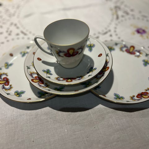 Diameter kopp 9cm, høgde 6,5cm. Diameter tefat 14,5cm.