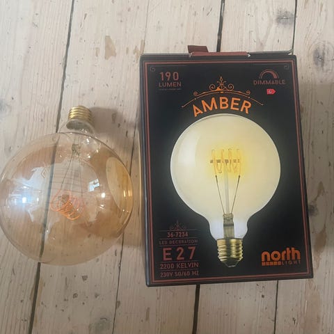 2 stk pene dimbare dekorpærer kjøpt på Clas Ohlson i høst. Ble for store for lampen. Gir et veldig fint lys, varmt i fargen.