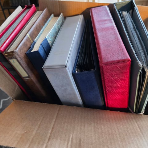 En skikkelig rotekasse ca 9,4 kg med Album og frimerker fra div land. Se bilder og beskrivelse under som gir ett inntrykk av innholdet. Hentes på Jessheim eller sendes mot forhåndsbetaling pluss porto. Porto kr 140,-. Se også mine andre annonser og rotekasser.