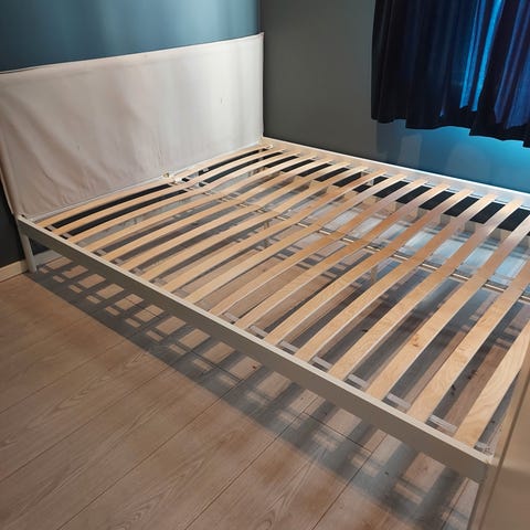 Kontinentalseng fra bohus. Har kloremerker etter katt, og planker i bunnen er knekt et par plasser, men de er reparert så sengen kan fint brukes. Sengen ligger lagret flatpakket, så den må skrus sammen igjen.