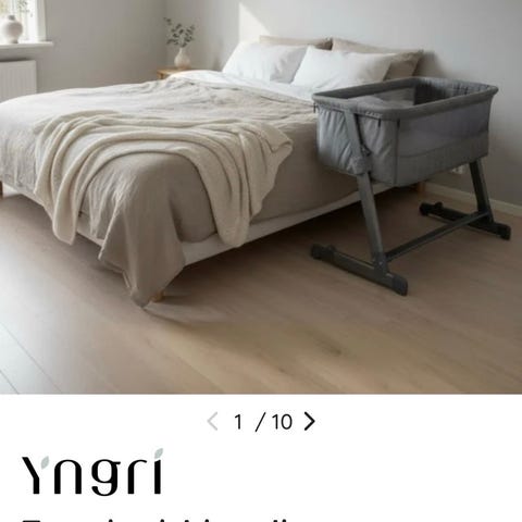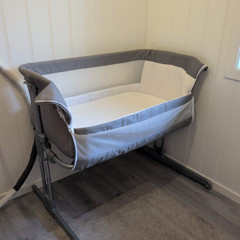 Kinderkraft Bedside Crib i nøytral farge med justerbar høyde. Laget for enkel montering ved siden av foreldreseng, designet for trygg bruk for spedbarn.