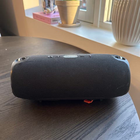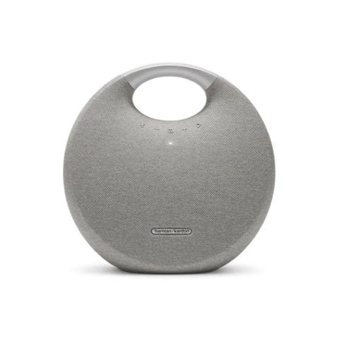 Harman Kardon Onyx Studio trådløs høyttaler i grå farge. Har integrert håndtak for enkel bæring. Leveres med strømadapter for lading og bruk.