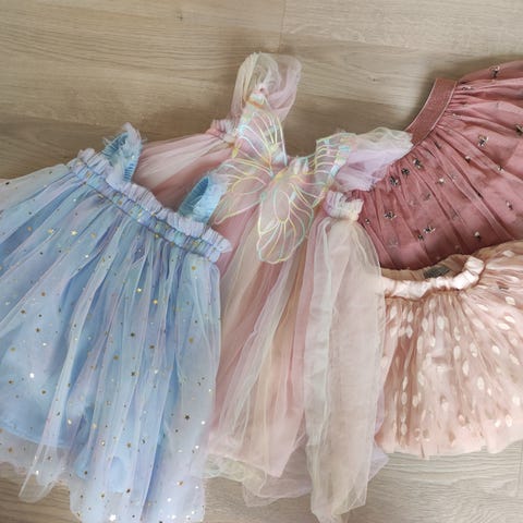 Topp, skjørt, lang ermet topp og strikk.