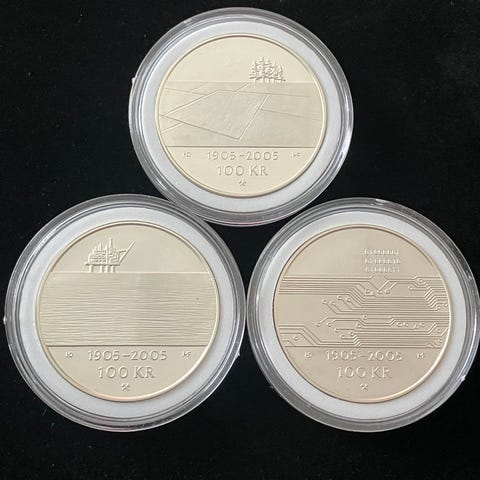 Hundreårsmyntene 2003-2005 minnemyntsett i sølv bestående av tre mynter fra årene 2004, 2005 og 2006. Mynter leveres i originalt etui for oppbevaring og visning.
