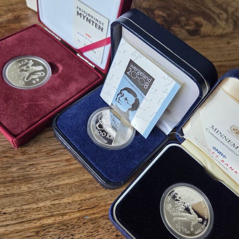 Sølvprisen i dag (23/1-26) betyr at det er over 1000,- i ren sølvverdi i hver mynt.