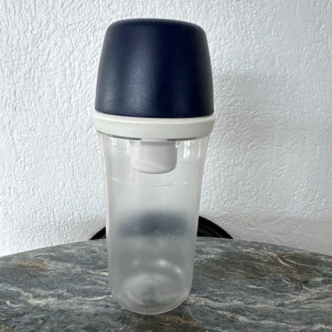 Liten skål i bunnen slik at du unngår søl når kvernen står på bordet eller i kjøleskapet.
