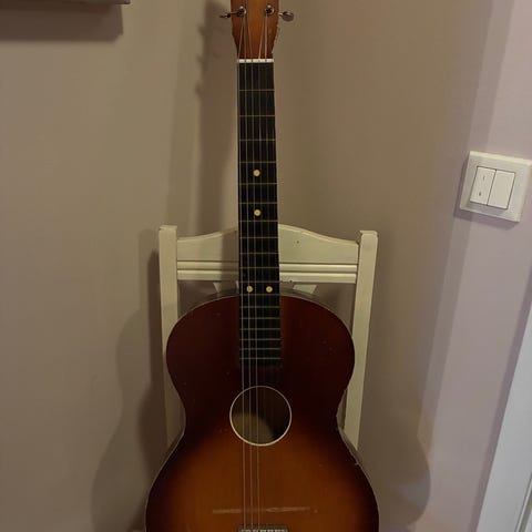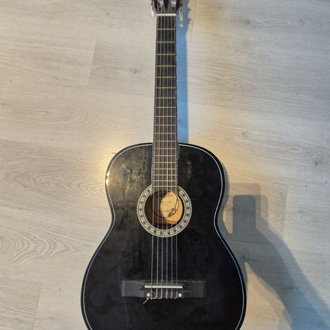 Akustisk gitar i rød og svart farge med medfølgende bæreveske. Passer til generell bruk innen akustisk gitarspill.