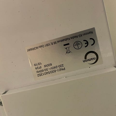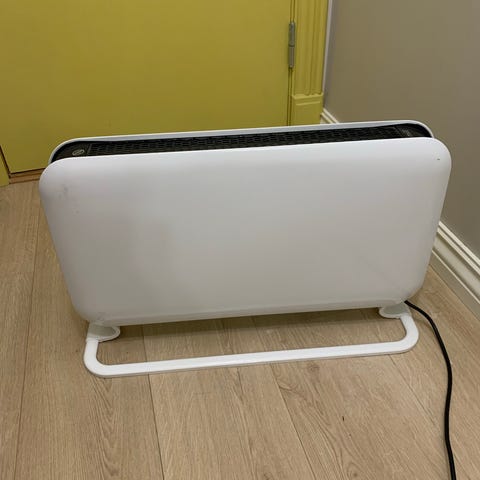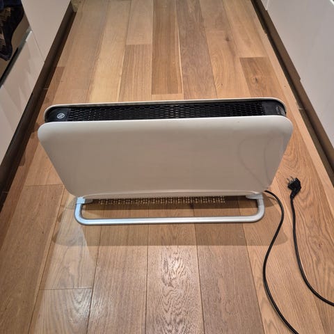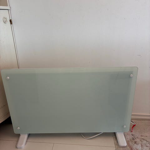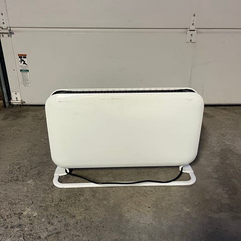 Elektrisk panelovn i hvit farge med metallramme og ledning med stikkontakt. Egnet for oppvarming av rom.