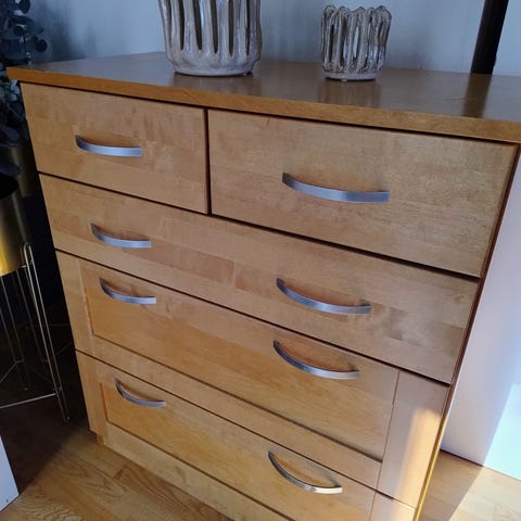 Brukt kommode med skap og skuff. Noe skjevheter på dørene, men funker fint. Selges pga flytting.