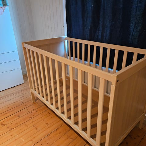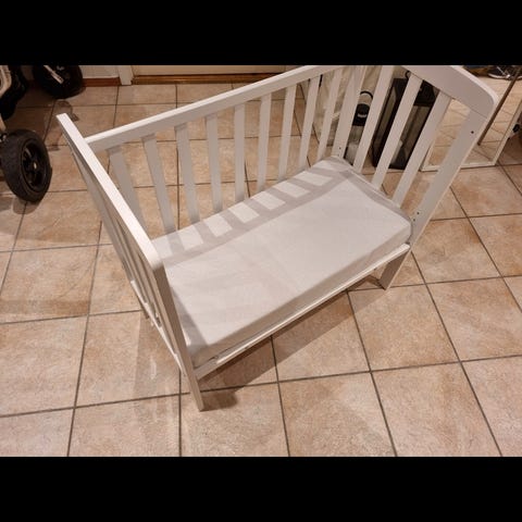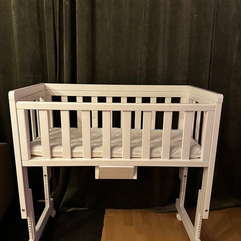 Selger en bedsidecrib. Kjøpt brukt og brukt av oss til ett barn. Har litt merker på seg. Madrass kan følge med om ønskelig, er litt flekker på den men er ikke forsøkt fjernet. Avtagbar side som enkel tas av og festes på igjen. Står på hjul så enkel å flytte på.
