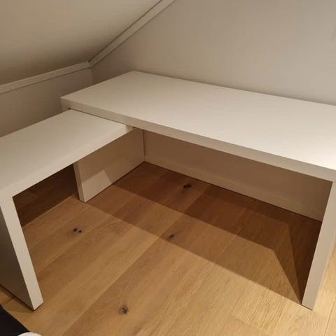 Selger et stilrent og funksjonelt skrivebord, tilsvarende Vandborg 60x120 cm fra JYSK. Dette skrivebordet passer perfekt for både hjemmekontor og studierom, med plass til PC, skjerm og annet kontorutstyr.