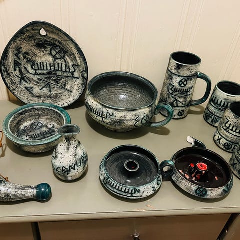 Jeg selger et flott keramikkservise fra Arol Keramikkfabrikk i Halden. Dette er håndlaget norsk keramikk med karakteristisk grønn og blå glasur, et klassisk og populært design fra norsk keramikkhistorie.