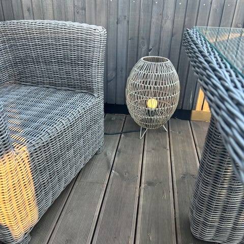 Lampe med batteri og timer. 55 cm høy og 30 cm i diameter. Lyser fint opp enten ute på terrassen eller i stuen.