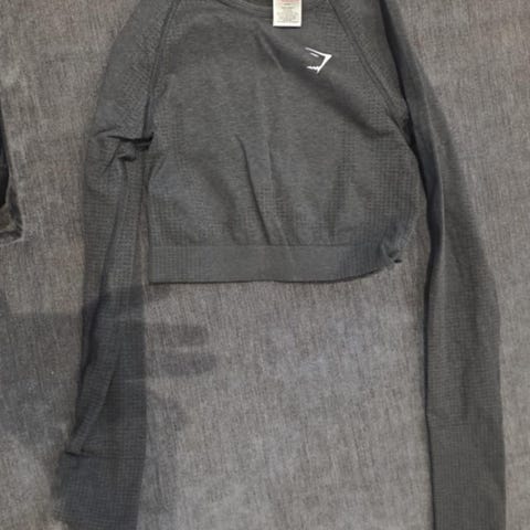 Gymshark treningsgenser i brun str. M. Hette, snøring, lufting og mønster i genseren og logo både foran og bak i hvit. Kun brukt et par ganger