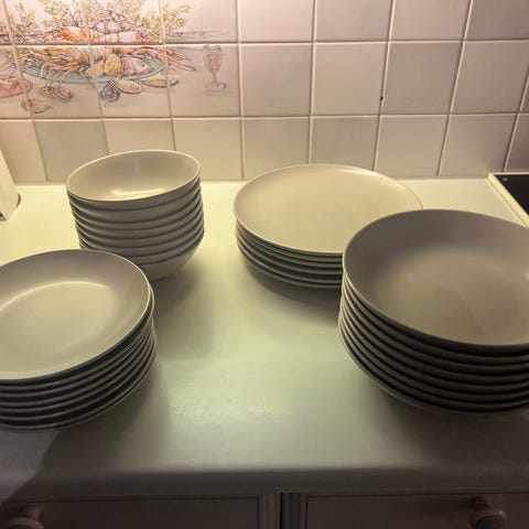 IKEA servise i svart keramikk bestående av flere tallerkener og boller i ulike størrelser. Passer til daglig bruk og servering.