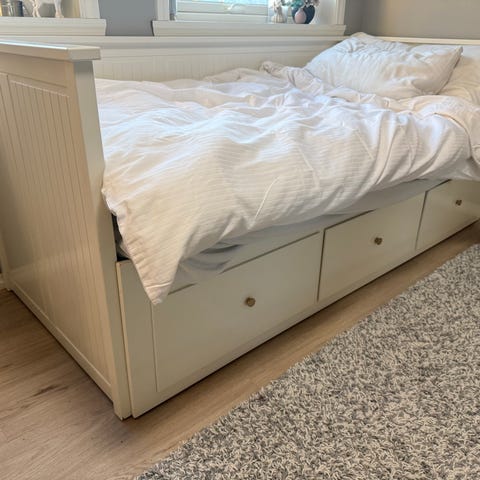 Pent brukt IKEA Hemnes dagseng i grå. Brukt av et barn. Sengen har 3 oppbevaringsskuffer og kan trekkes ut som gjeste seng eller brukes som stor seng.